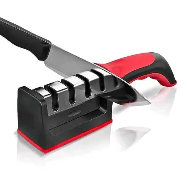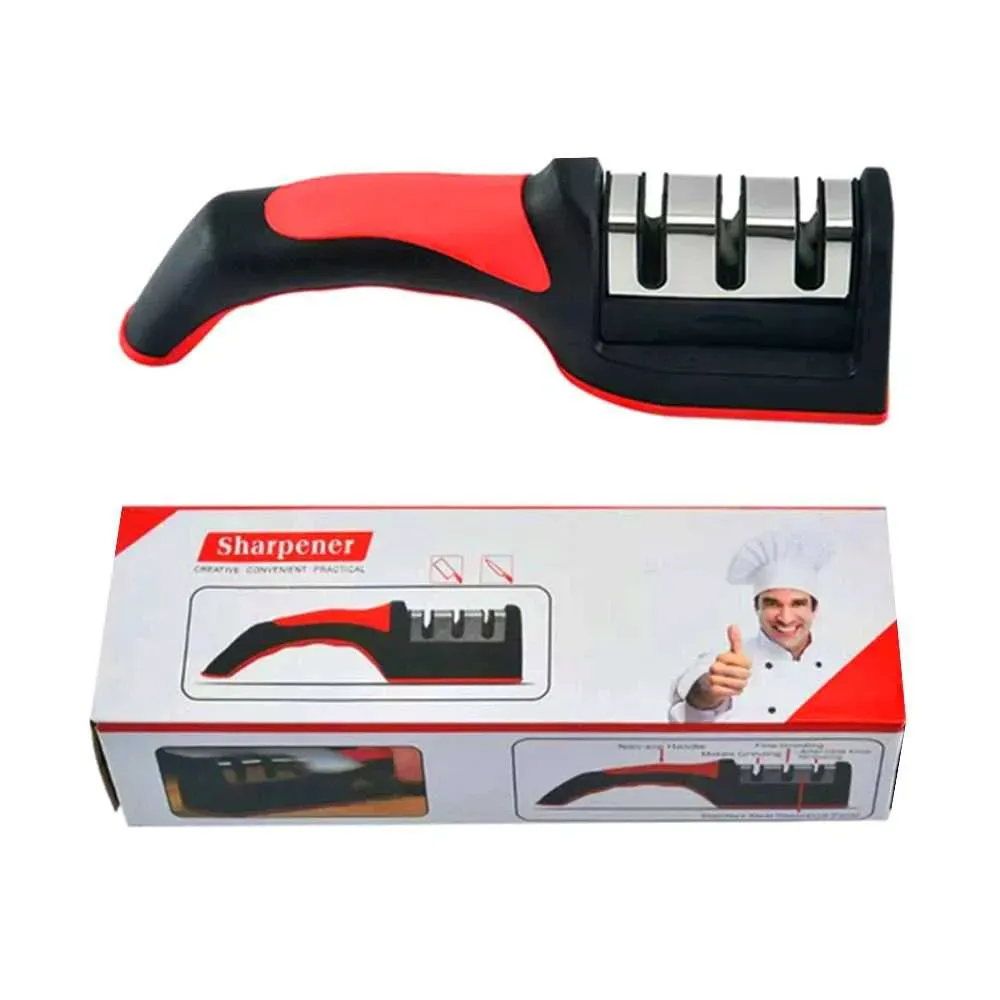 • Afilador de cuchillos de tres etapas, alta resistencia hecho de ABS de alta calidad y acero inoxidable.