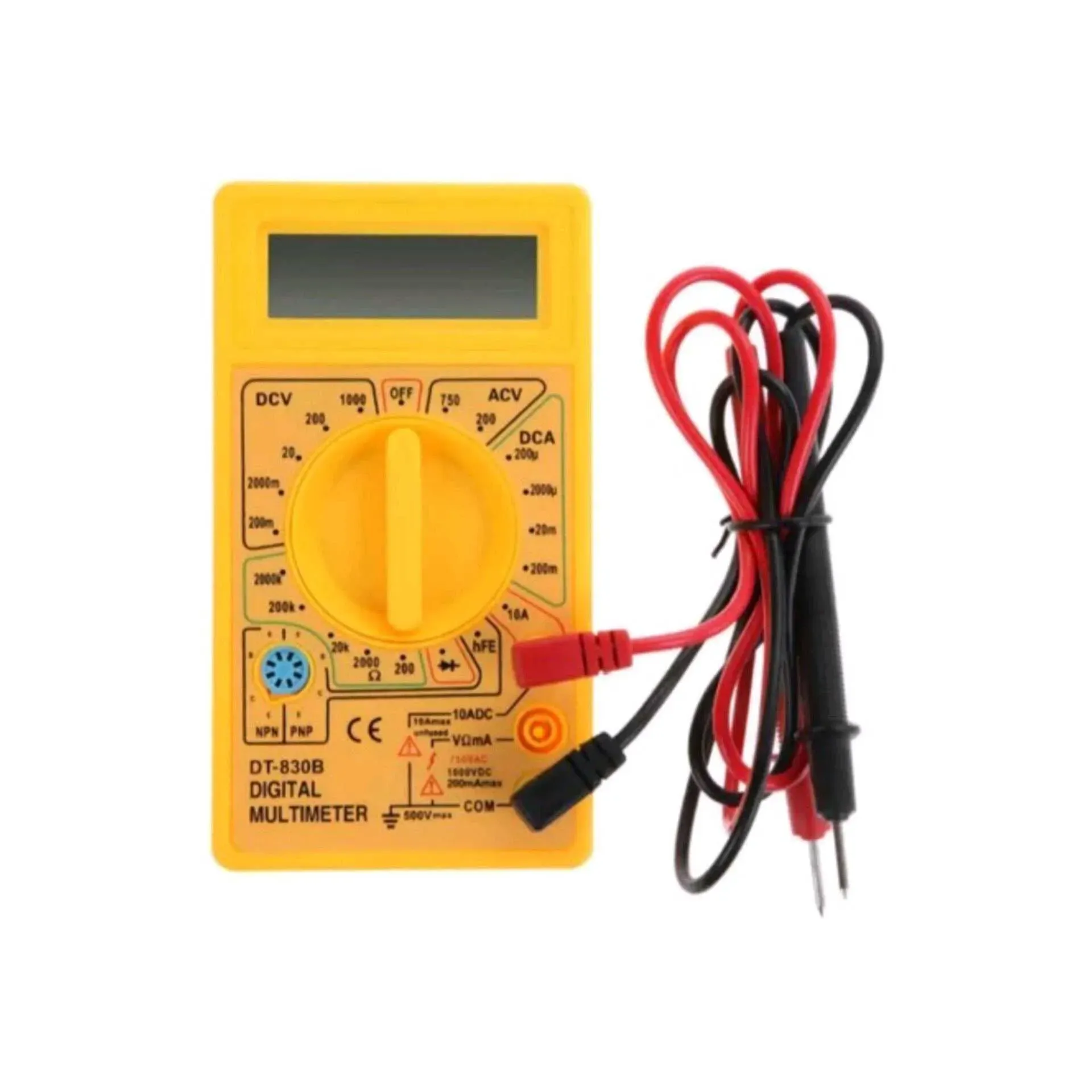 Multímetro digital modelo DT830B de uso general o doméstico. Cuenta con pantalla de polaridad automática y protección de sobre carga en todos los rangos. Funciona con una frecuencia de muestreo de 3 veces por segundo e indicación de bajo voltaje de la batería.